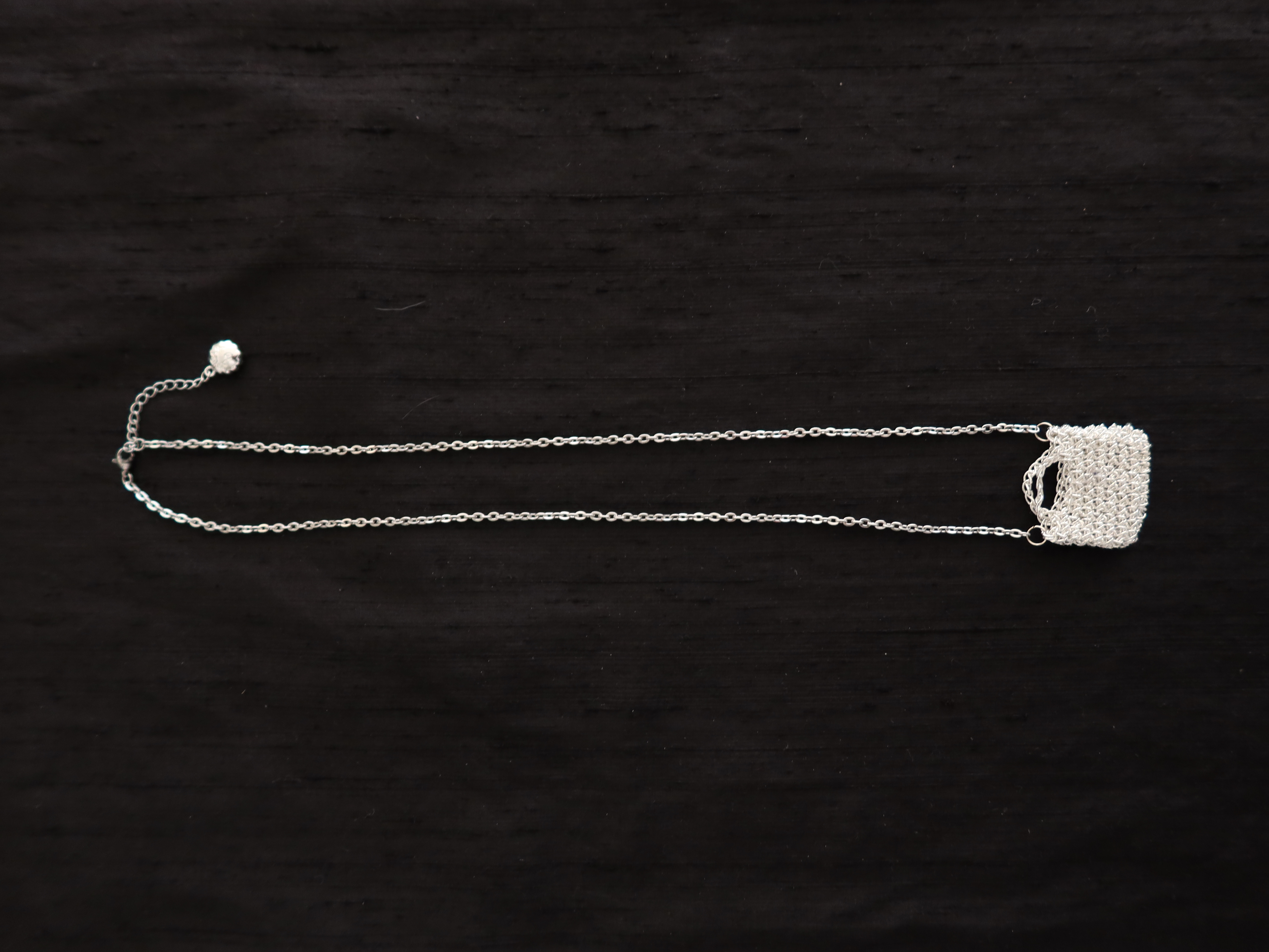 - 주문제작 상품으로 결제완료 후 3-14일의 제작기간이 소요됩니다. - 가방의 형태를 그대로 축소하여 펜던트로 제작된 네크리스입니다. - 순은 필름을 더한 메탈릭 원사로 제작된 펜던트는 빛에 따라 더욱 또렷하게 반짝입니다. - CROCHEANT 의 플라워모티브의 로고참