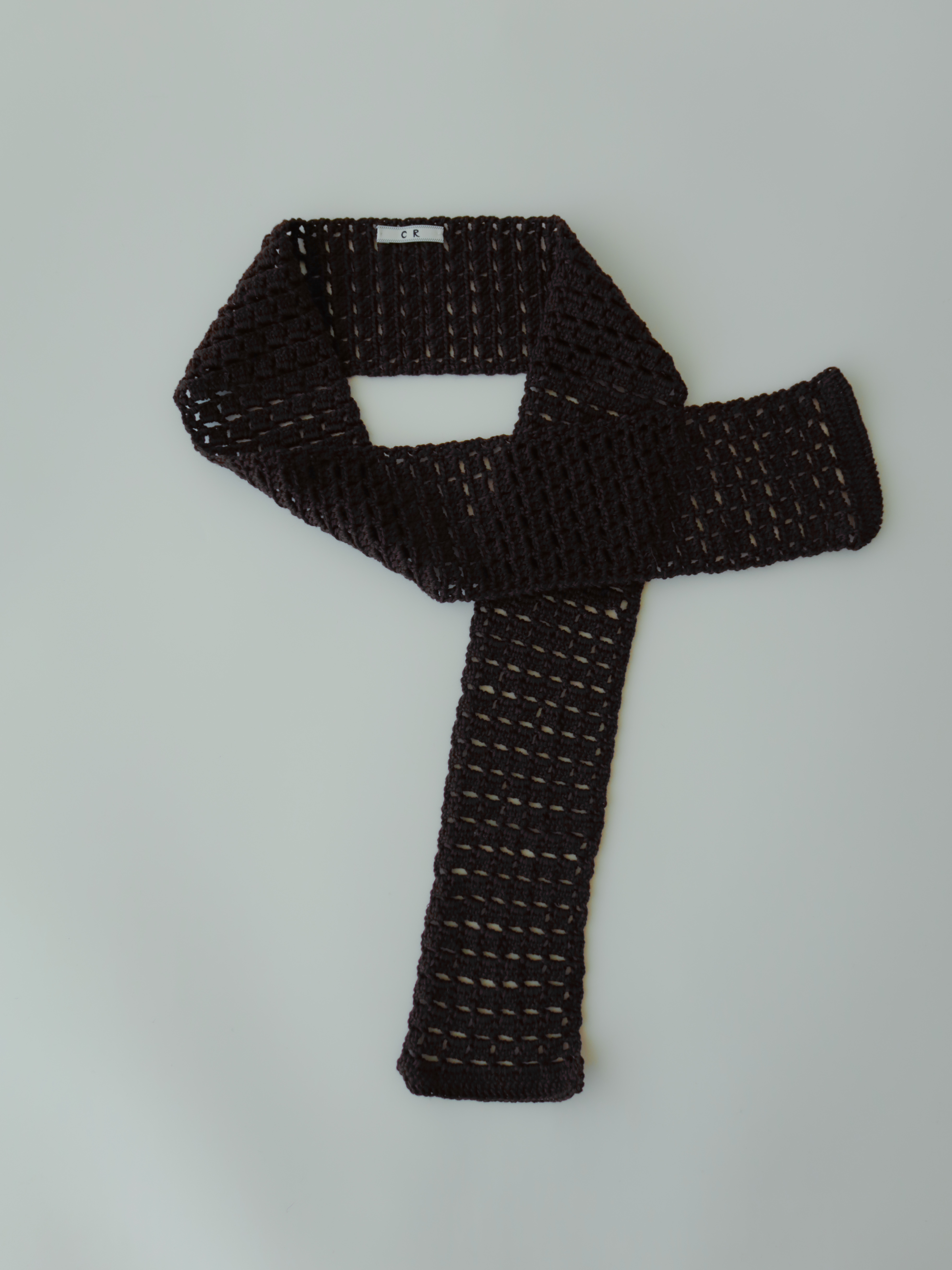 격자 형태의 구조를 따라 하나씩 손으로 뜨개 제작한 스카프입니다.